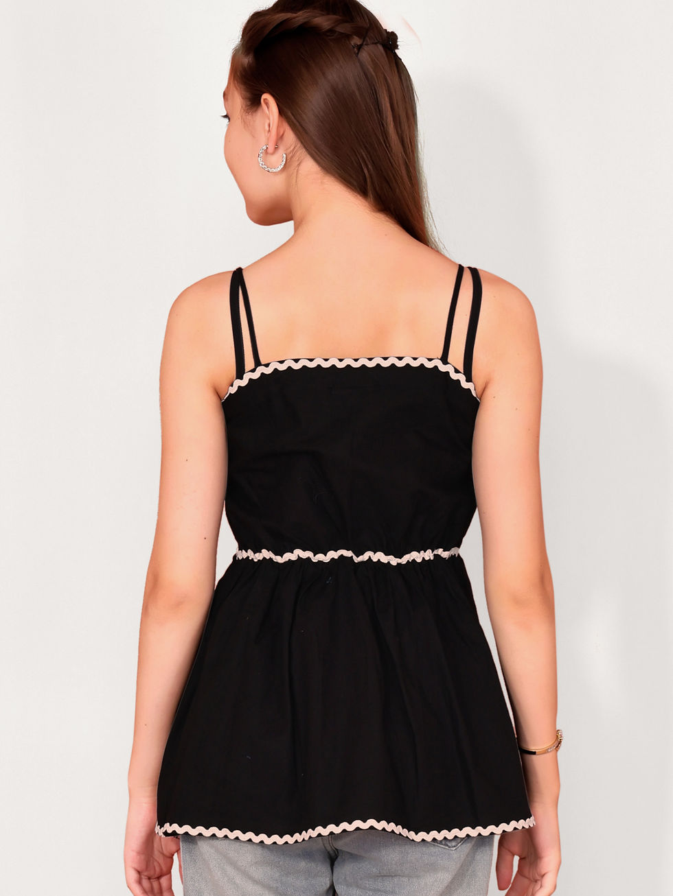 Crafted from a luxurious blend of cotton and linen, this top features delicate black lace detailing for an elegant touch. The spaghetti straps add a flirty, feminine flair, making it perfect for both casual and dressy occasions. The breathable fabric ensures comfort while keeping you stylish.